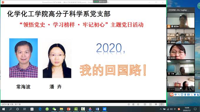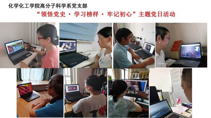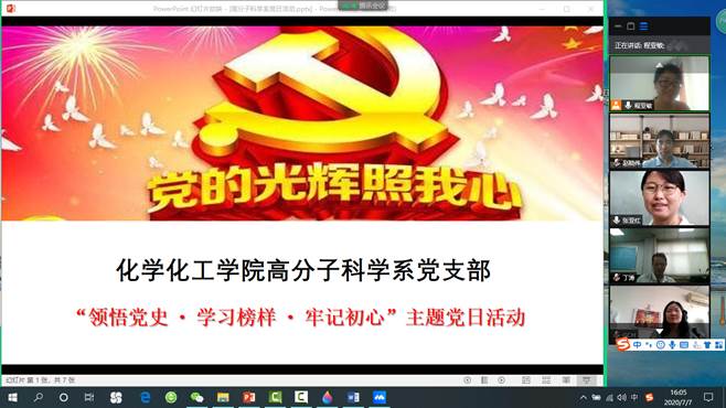 和化学化工学院党委的要求,高分子科学系党支部于7月7日采取线上活动的方式,深入开展了“领悟党史 – 学习榜样 – 牢记初心”主题党日活动,学院党委委员、副院长张磊和高分子科学系全体党员同志参加。